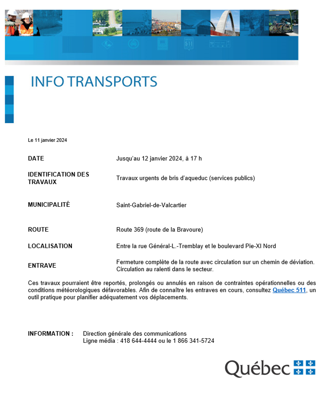 Afin de connaßtre les entraves en cours, consultez Québec 511, un outil pratique pour planifier adéquatement vos déplacements.