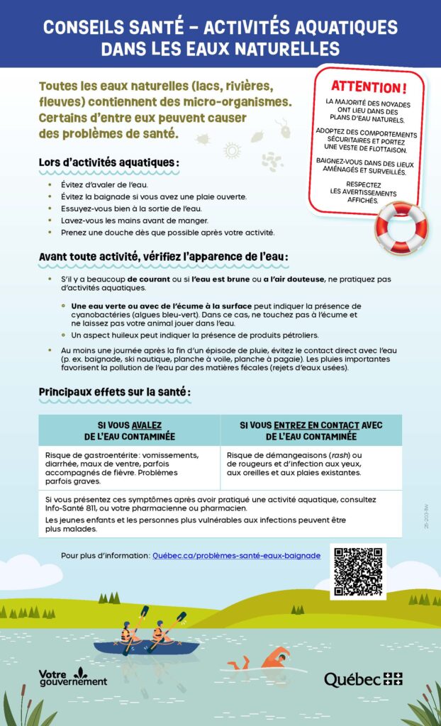 đ CONSEILS DE SANTĂ â ACTIVITĂS AQUATIQUES DANS LES EAUX NATURELLES đââïž PubliĂ© le 30 juin 2025 En cette saison estivale ponctuĂ©e de journĂ©es chaudes, le CIUSSS de la Capitale-Nationale demande aux municipalitĂ©s de faire un rappel concernant les conseils de prĂ©vention liĂ©s Ă la santĂ© et aux activitĂ©s aquatiques dans les eaux naturelles. La Ville vous invite Ă prendre connaissance de lâaffiche ci-jointe. Pour en savoir plus đ https://www.ciusss-capitalenationale.gouv.qc.ca/sante-publique/sante-environnement/baignade-milieu-naturel