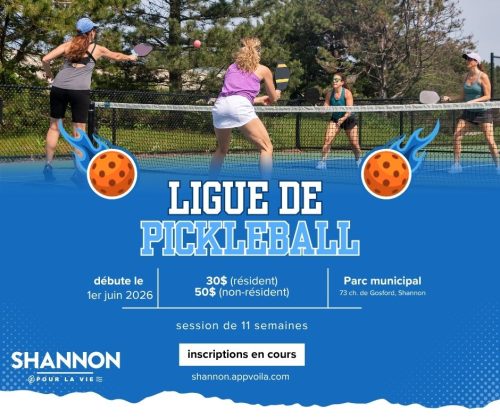 Lieu: Terrains de pickleball #1 à #5, situés sur la grande patinoire de hockey, au Parc municipal de la Ville de Shannon au 73, chemin Gosford, Shannon, G3S 0W4