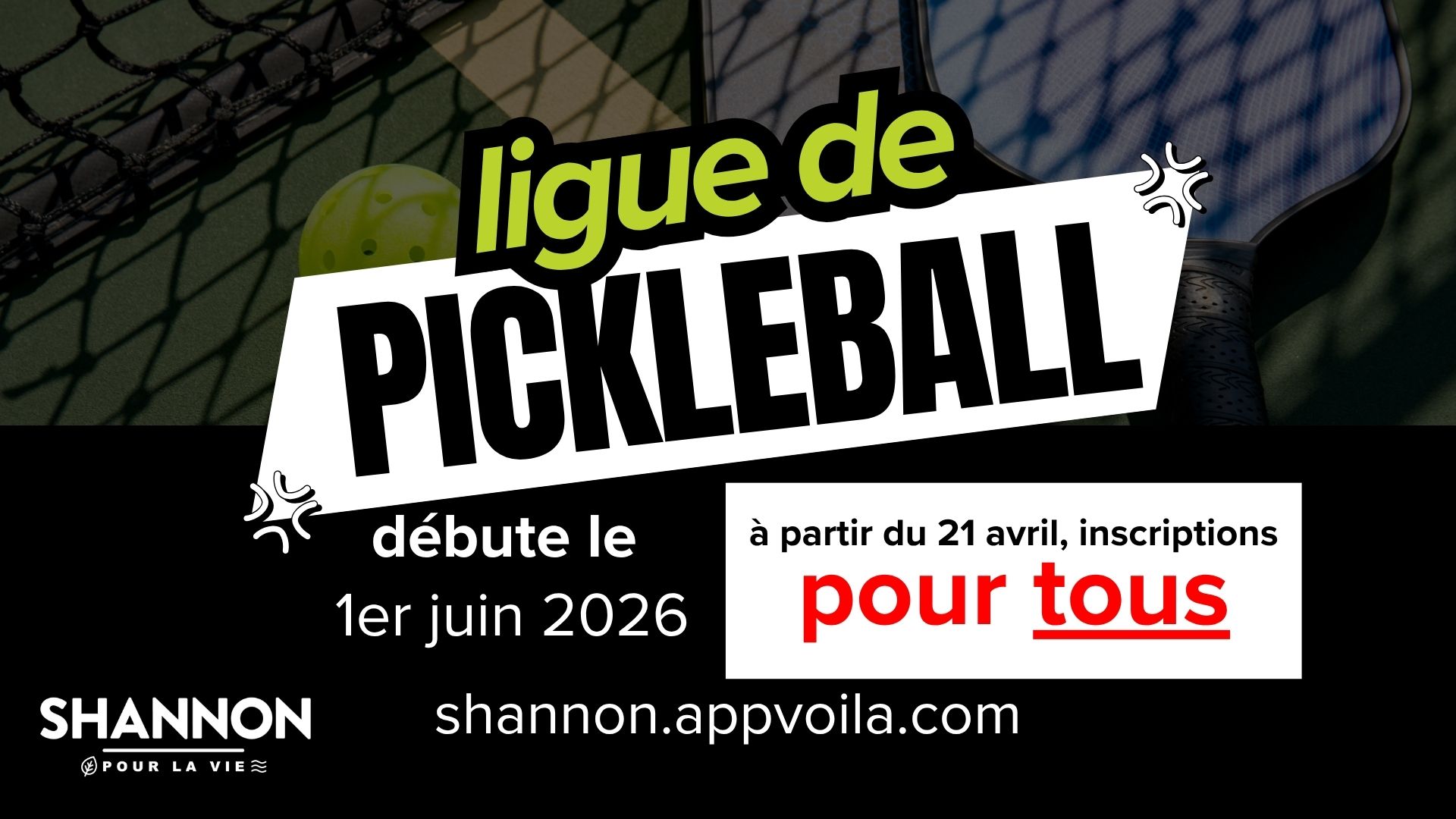 Lieu: Terrains de pickleball #1 à #5, situés sur la grande patinoire de hockey, au Parc municipal de la Ville de Shannon au 73, chemin Gosford, Shannon, G3S 0W4