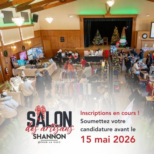 Les inscriptions pour le Salon des artisans de Shannon 2026 sont officiellement ouvertes! Publié le 15 avril 2026 Les inscriptions pour le Salon des artisans de Shannon 2026 sont officiellement ouvertes! Inscrivez-vous directement sur notre site web shannon.ca/salon-des-artisans-de-la-ville-de-shannon Date limite d’inscription pour l’édition 2026: vendredi le 15 mai Nous avons hâte de découvrir vos œuvres et vos produits! Pour toute question à ce sujet, contactez le Service des loisirs : 418 844-3778 loisirs@shannon.ca