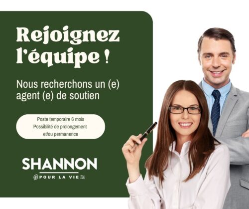 Offre d’emploi – Agent de soutien Publié le 13 novembre 2025 Envie d’un emploi où le bien-être, la collaboration et le plaisir font partie du quotidien ? Rejoignez l’équipe ! À la Ville de Shannon, on mise sur l’humain, la croissance et l’engagement. Joignez-vous à une équipe passionnée, au cœur d’une Ville en plein essor ! Consultez l’offre d’emploi