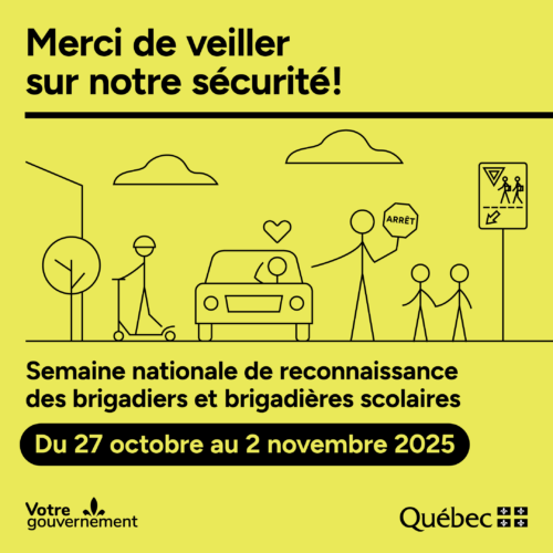 « Quâil pleuve, neige ou vente, nos brigadiers et brigadiĂšres scolaires sont lĂ pour protĂ©ger, encadrer les traversĂ©es et rappeler les rĂšgles de sĂ©curitĂ© routiĂšre Ă nos enfants. Votre travail est essentiel et profondĂ©ment apprĂ©ciĂ© ! » – Sarah Perreault, mairesse.