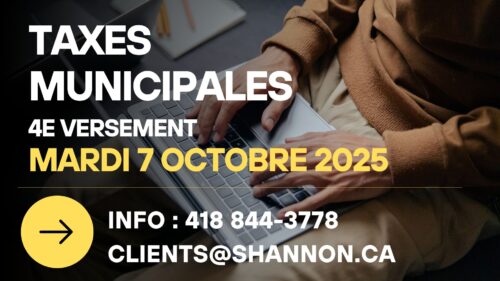 TAXES MUNICIPALES : PROCHAIN VERSEMENT LE 7 OCTOBRE Publié le 29 septembre 2025 La Ville souhaite rappeler aux citoyens que le 4ᵉ 𝐯𝐞𝐫𝐬𝐞𝐦𝐞𝐧𝐭 𝐝𝐞𝐬 𝐭𝐚𝐱𝐞𝐬 𝐦𝐮𝐧𝐢𝐜𝐢𝐩𝐚𝐥𝐞𝐬 est prévu le mardi 7 octobre 2025. Il est possible de 𝐩𝐚𝐲𝐞𝐫 𝐞𝐧 𝐥𝐢𝐠𝐧𝐞 : une solution simple et rapide ! https://shannon.ca/servi…/finances/taxation-et-perception/ Vous avez des questions ou n’avez pas reçu votre compte de taxes ? Communiquez avec le 𝐒𝐞𝐫𝐯𝐢𝐜𝐞 𝐝𝐞𝐬 𝐟𝐢𝐧𝐚𝐧𝐜𝐞𝐬 au 𝟒𝟏𝟖 𝟖𝟒𝟒-𝟑𝟕𝟕𝟖 ou par courriel à 𝐜𝐥𝐢𝐞𝐧𝐭𝐬@𝐬𝐡𝐚𝐧𝐧𝐨𝐧.𝐜𝐚.